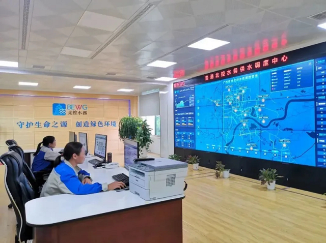 在廣西貴港市,北控水務供水調度中心的大屏上,貴港全市的供水管線明亮閃爍,供水量、水壓、pH值、渾濁度、余氯等實時監測數據不停跳動,工作人員隨時觀察著數據變化,對廠站及供水管網運行狀態持續監控,發現問題立即派發指令和電子工單進行適時調整,確保全市人民用水的穩定與安全。