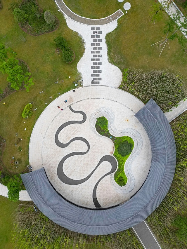 來到文博公園山頂,圓弧形風雨連廊形成一個圈,圈里是“海綿+文化”的巧妙融合而形成的標志性景點——曲水流觴。風雨連廊房頂斜坡的雨水,從屋檐滴落到碎石帶上,經過消能、凈化后,匯入蓄水池。