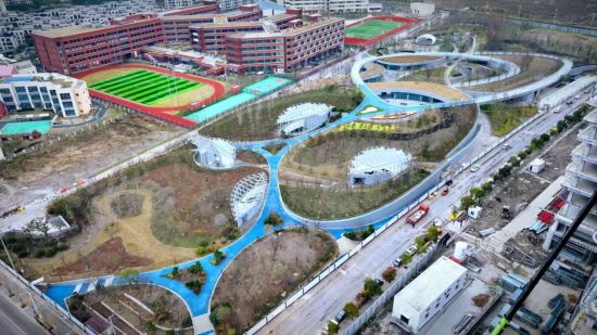 該綠地位于上海臨港滴水湖西側(cè),北鄰洛神花路,南至雪絨花路,東至白荊路,西至云皓路,南側(cè)緊鄰規(guī)劃公交首末站。建設(shè)總用地面積約56109.4平方米,項(xiàng)目以“立體公園、綠色碳匯”為主題進(jìn)行設(shè)計(jì)施工。巧妙利用地形起伏構(gòu)建出不同高差道路,并融入周邊多個(gè)住宅小區(qū)、寫(xiě)字樓以及華東師范大學(xué)附屬幼兒園、附屬中學(xué),實(shí)現(xiàn)與環(huán)境的生態(tài)共聯(lián),并為周邊各類(lèi)人群提供了地上地下豎向立體的休憩空間。同時(shí),該綠地大規(guī)模運(yùn)用環(huán)保材料與精心配置的碳匯植物,打造了綠色屋頂、透水鋪裝、雨水花園等一系列先進(jìn)的海綿設(shè)施,充分發(fā)揮綠地系統(tǒng)“滲、滯、蓄”的功能,從而達(dá)到雨水源頭“凈”的目標(biāo),將景觀功能與生態(tài)功能一體化,在確保排水防澇安全的前提下,最大限度地實(shí)現(xiàn)雨水的積存、滲透和凈化,促進(jìn)雨水資源的利用和生態(tài)環(huán)境保護(hù)。