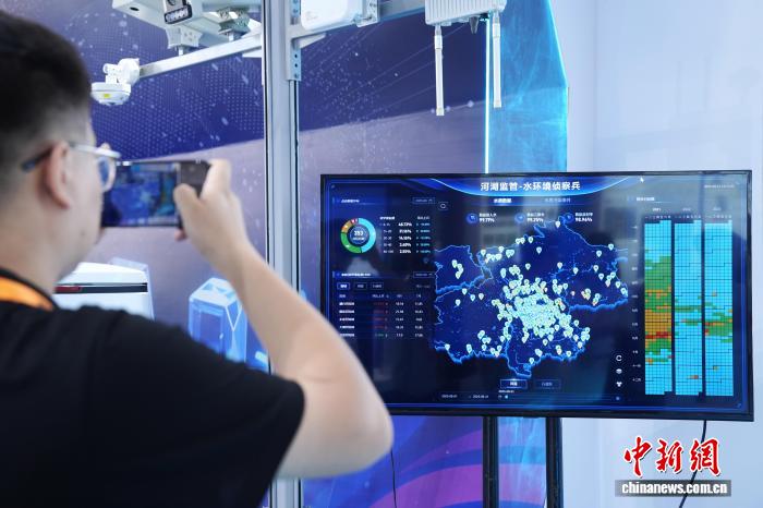 9月11日,在北京舉行的2025年服貿會北京水務科技創新展區,觀眾了解河湖監管系統。據了解,該展區總面積超800平方米,設置濱水空間、數智水務、健康水業及水利水電工程建設四大板塊,集中展示北京水務在科技領域的技術突破與示范應用。中新社記者張祥毅攝